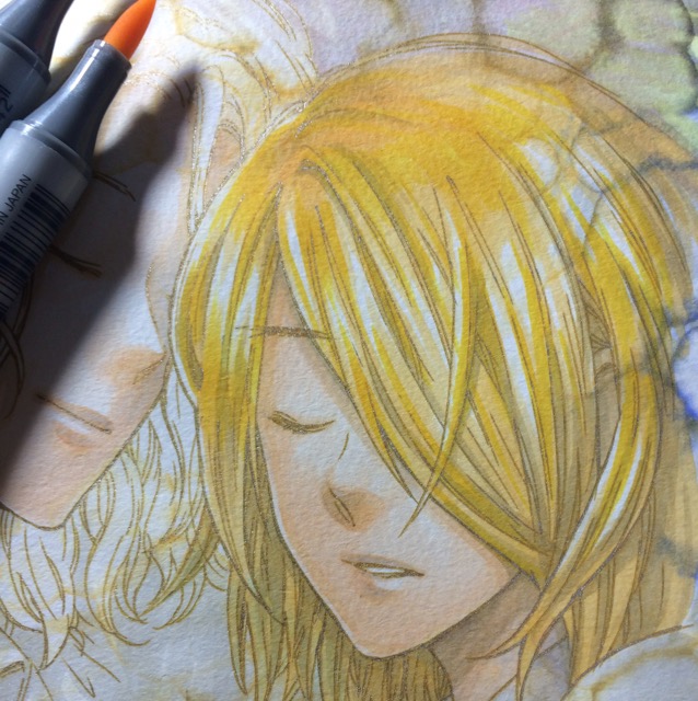コピックでイメージしている色をざっくりのせて、アルコールをぽたぽた垂らしてぼかしています